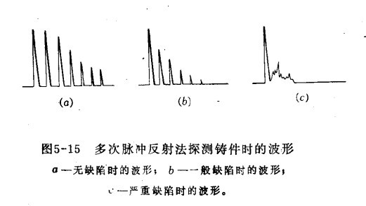 探伤铸件的方法,通常采用多次脉冲反射法,有时也用一次脉冲反射法来确定缺陷位置。多次脉冲发射法是利用声波在缺陷界面的反射和缺陷对声波衰减的原理进行探测的。对于较厚且形状简单的工件,用此方法探测是比较适宜的。当工件内部无缺陷时,则出现铸件底部的多次反射波,其波幅铸件减小,并呈指数曲线衰减,如下图a所示,当工件内部存在疏松等缺陷时,会造成声波散射,使声能衰减,则底波反射次数减少,如下图b所示,当工件内部存在严重的缺陷,则底波消失或只有杂波,如下图c所示。由工件底波的衰减状态,即可判断有无缺陷和严重程度。