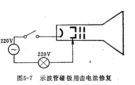 3.示波管两极间漏电,可用高压电压法试修,将示波管第二阳极电压(3000伏)接漏电的一极,另一极通地,有可能将漏电杂物烧掉