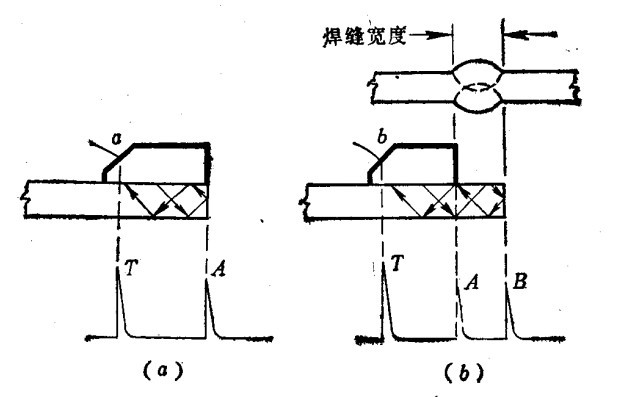 焊缝宽度法主要是利用横波多次反射的探伤原理,来探测整个焊缝区域中的缺陷。探测时需在焊缝两侧进行,以免漏检。将探头放在工件厚度相同的试块上,超声波探伤仪探头前沿和试块前沿对齐,在荧光屏上得到极端反射波A,然后向后移动探头,移动距离等于焊缝宽度,在荧光屏上又得到极端反射波B,并标出(用闸门波或机械刻度尺标出)A波与B波的位置,如图所示