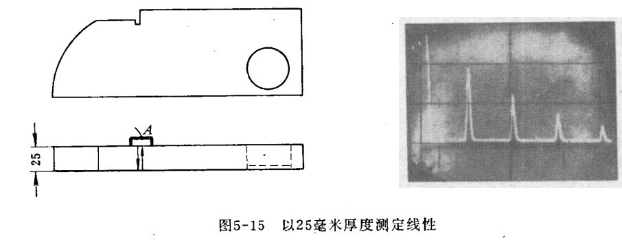 二、时间基线(扫描线)线性的测定 用直探头(纵波)测定,发射波调整在荧光屏的零点上。例如时间基线为0~100毫米时,将探头放在试块的A位置,以25毫米的多次反射波进行校正。微调扫描速度,使第一次反射波出现在25处,如果扫描线性好,第二、三、四次应分别与50、75、100刻度重合。否则多次反射波不成比例的出现在荧光屏上。