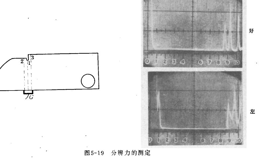六、分辨力的测定 下图探头在G位置,可测定分辨力。探头移动,使之在85、91和100刻度处获得三个回波。如果三个波是分离的,则分辨力好。否则,分辨力差。