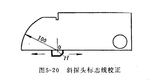 七、斜探头波束零点线的校正 斜探头有机玻璃楔块上的零点线和压电晶片的中心线重合。斜探头在H位置移动,直到从100毫米弧度处获得最大的反射波为止,如斜探头零点线与试块上0点重合,则斜探头的零点线正确。否则,需移动探头的晶片,直至重合为止。此时斜探头的零点线即为声波主线的入射点。