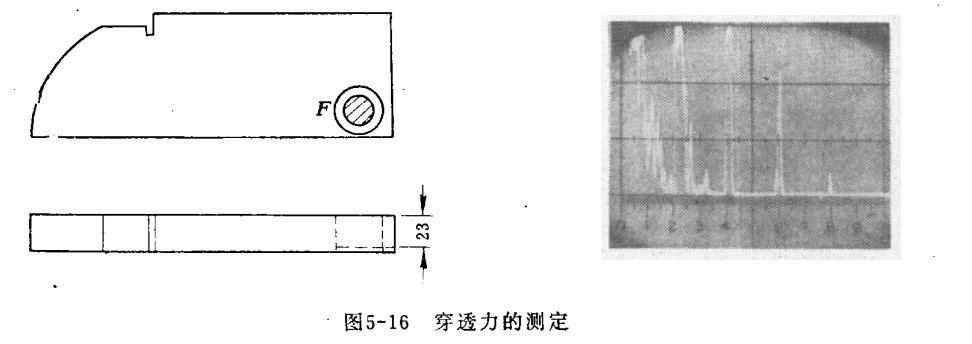 三、放大器线性的测定 如下图所示,将超声波探伤仪探头放在F位置的有机玻璃块上探测,有机玻璃的厚度相当于50毫米钢的厚度。测定时,灵敏度的控制由最小开至最大,高穿透力仪器有6~10个反射波,低穿透力的仪器只有2~4个反射波。
