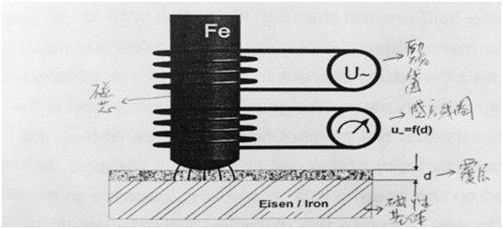 ○原理:将玻璃钢层当做一个非磁性的涂层,在其下垫磁性金属基体。进行涂层测厚。(见原理图)